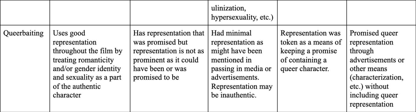 Type of RepresentationAmount Did they use misrepresenting tropes? Was there queer baiting?
